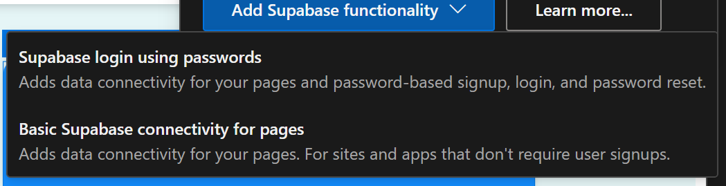 Your entry point to connecting your product with supabase, is the button in the top right of your screen, with the green Supabase logo on it. When your project is not connected to Supabase, you will see this when you click the button.